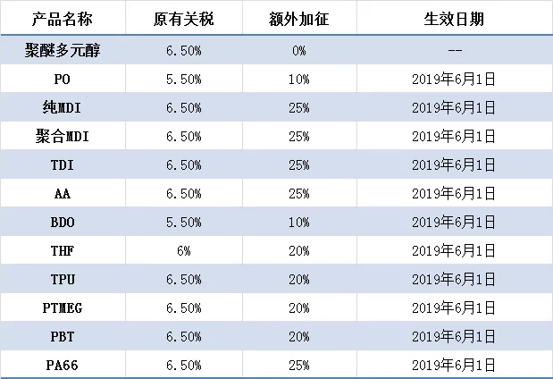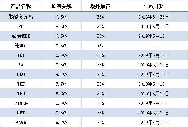 中美贸易战之主要PU原材料加征税额大汇总