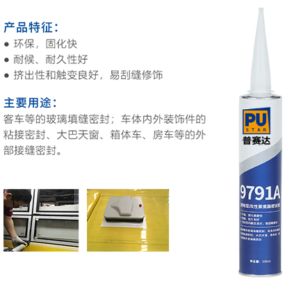 客车等的玻璃填缝密封;车体内外装饰件的粘接密封、大巴天窗、箱体车、房车等的外部接缝密封。