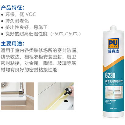 6230为单组分湿气固化密封胶,采用中性硅酮胶作为原料, 对环境无污染,与金属、陶瓷、玻璃、石材等多种基材具有良好的密封粘接性能。