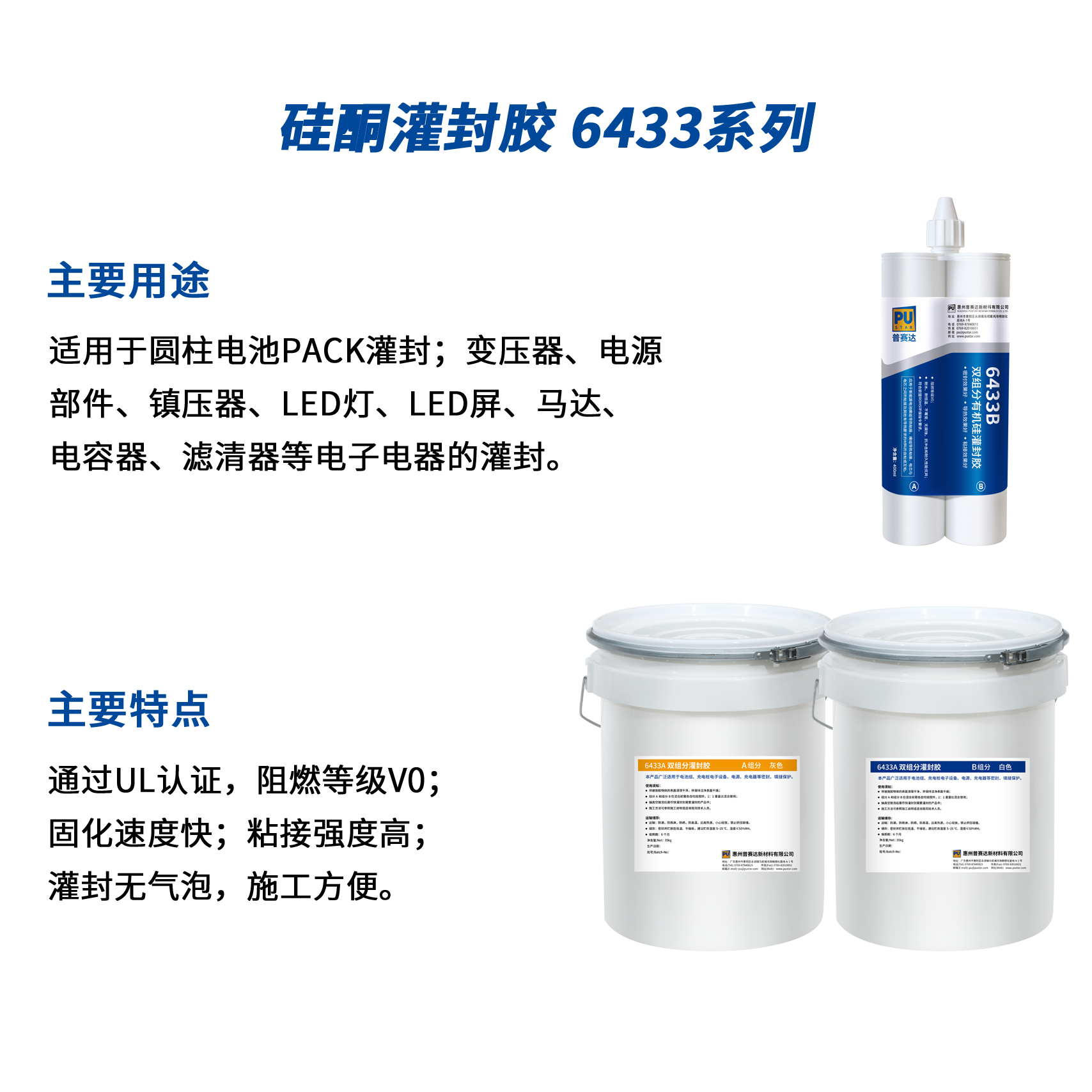 适用于圆柱电池PACK灌封;变压器、电源部件、镇压器、LED灯、LED屏、马达、电容器、滤清器等电子电器的灌封。