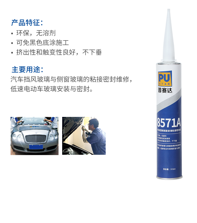单组分湿气固化聚氨酯密封胶,具有优良的密封性能和内聚力,对被粘基材无腐蚀,无污染,与金属、玻璃等多种基材粘接性好。