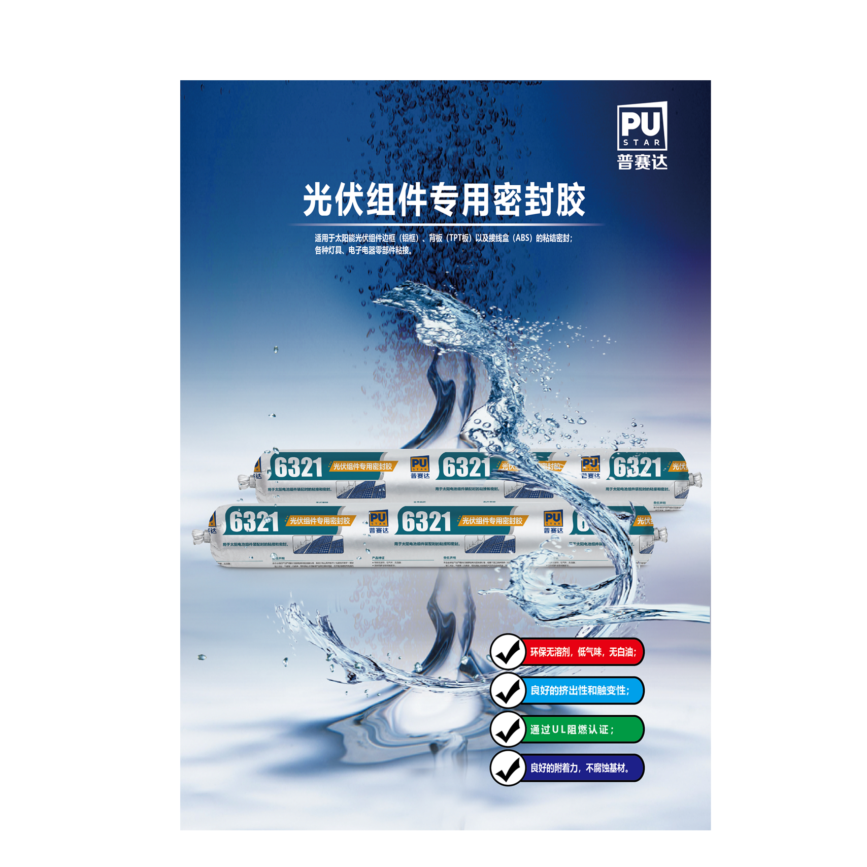 6321 是一种单组分湿气固化中性硅酮密封胶,具有良好的密封性能和内聚力。该产品对铝材,钢化玻璃,复合背材,接线盒材料有良好的粘结性,不腐蚀接线盒材料,可用于太阳能光伏板组件边框以及接线盒的粘结密封。